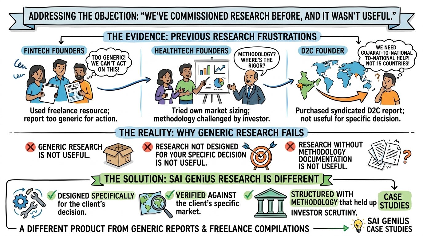 The evidence: The FinTech founders had previously used a freelance research resource whose report they had found too generic to act on. The HealthTech founders had tried to produce their own market sizing and had been challenged on the methodology by their investor. The D2C founder had purchased a syndicated D2C sector report that covered 15 countries and was not useful for a Gujarat-to-national expansion decision.