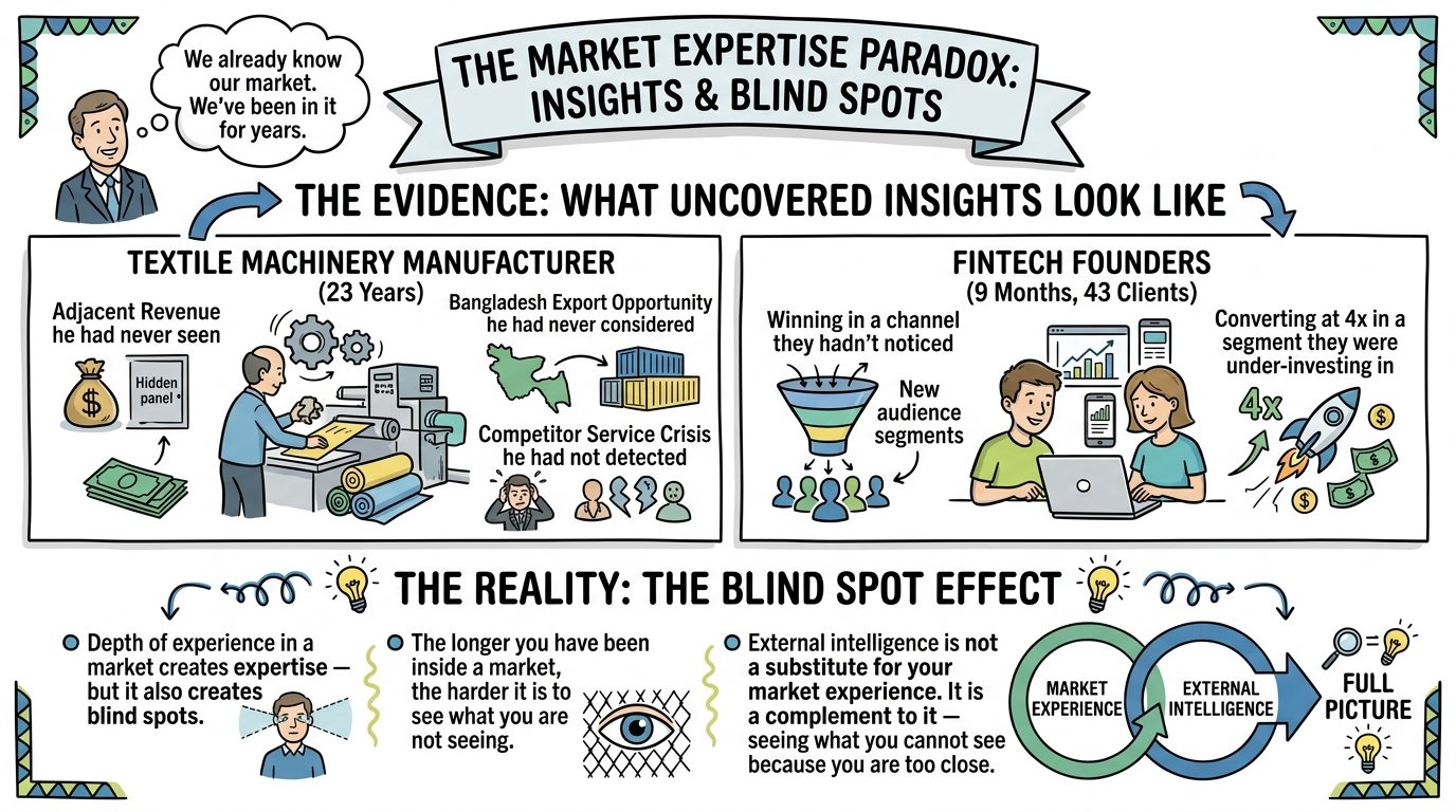 The evidence: The textile machinery manufacturer had been in his market for 23 years when the research revealed adjacent revenue he had never seen, a Bangladesh export opportunity he had never considered, and a competitor service crisis he had not detected. The FinTech founders had been operating for 9 months and processing 43 active clients when the research revealed they were winning in a channel they hadn’t noticed and converting at 4x in a segment they were under-investing in.