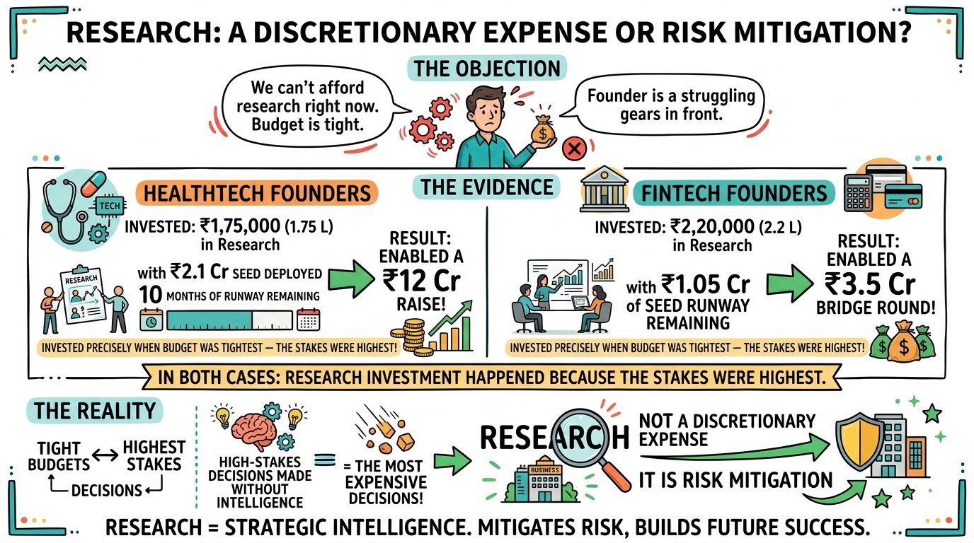 The evidence: The HealthTech founders invested ₹1,75,000 in research with ₹2.1Cr seed capital deployed and 10 months of runway remaining. The research enabled a ₹12Cr raise. The FinTech founders invested ₹2,20,000 with ₹1.05Cr of seed runway remaining. The research enabled a ₹3.5Cr bridge round. In both cases, the research investment happened precisely when the budget was tightest — because the stakes of the decision were highest.