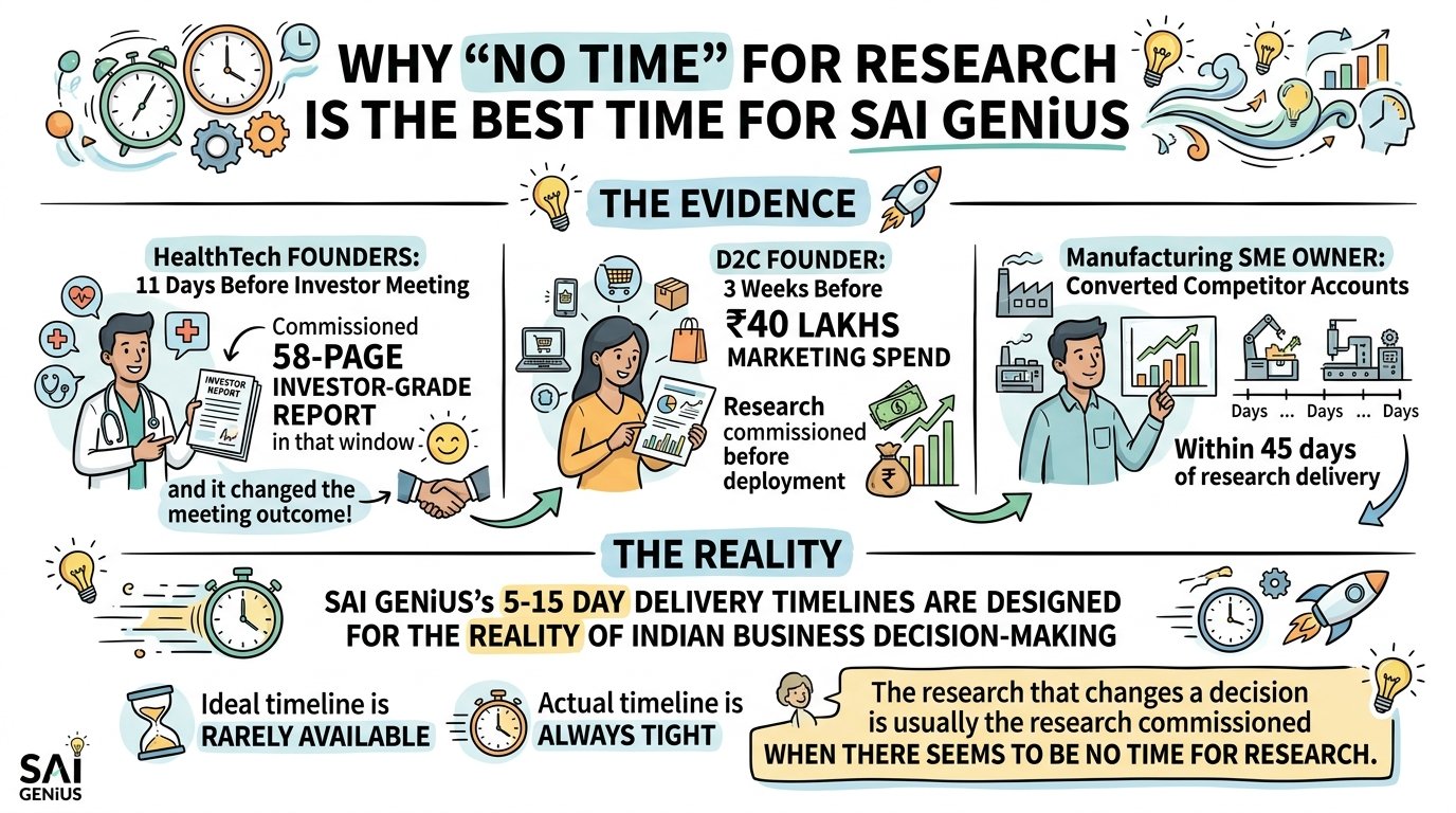 The evidence: The HealthTech founders had 11 days before their investor meeting. They commissioned a 58-page investor-grade report in that window — and it changed the outcome of the meeting. The D2C founder commissioned research 3 weeks before ₹40 lakhs of marketing spend was due to be deployed. The manufacturing SME owner converted competitor accounts within 45 days of research delivery.