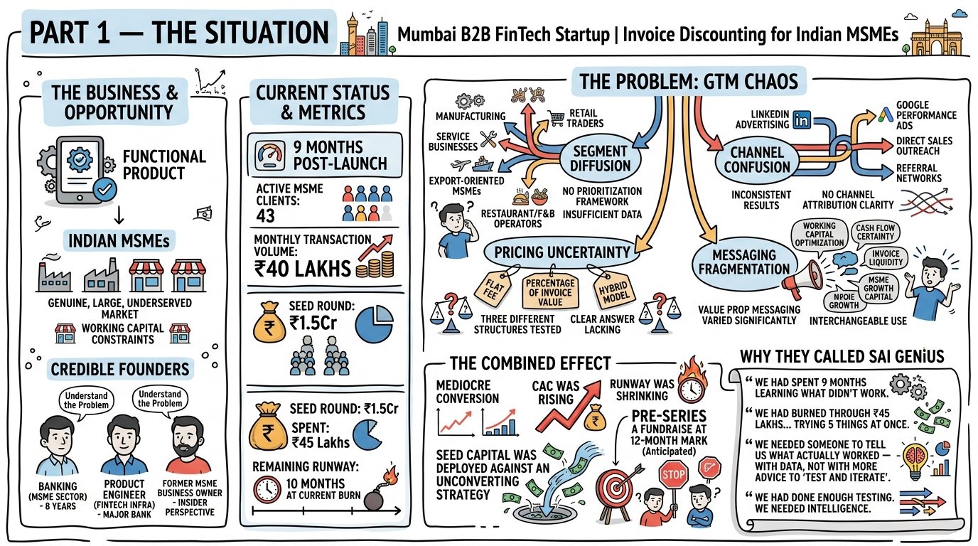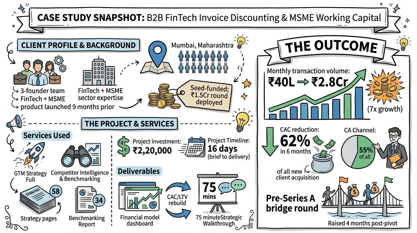 The business: A Mumbai-based B2B FinTech startup had built an invoice discounting platform designed to solve working capital constraints for Indian MSMEs — a genuine, large, and underserved market. The product was functional. The founders were credible: one had 8 years of MSME sector banking experience, one was a product engineer who had built fintech infrastructure at a major Indian bank, and one was a former MSME business owner who understood the problem from the inside.
