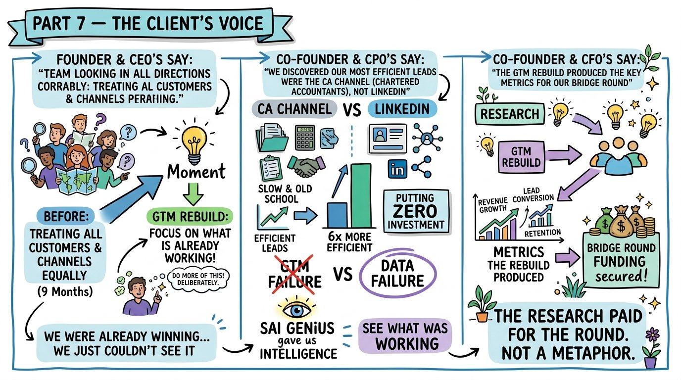 “The bridge round happened because of the metrics the GTM rebuild produced. And the GTM rebuild happened because of the research. The research paid for the round. That is not a metaphor.” — Co-Founder & CFO, B2B FinTech Startup, Mumbai.