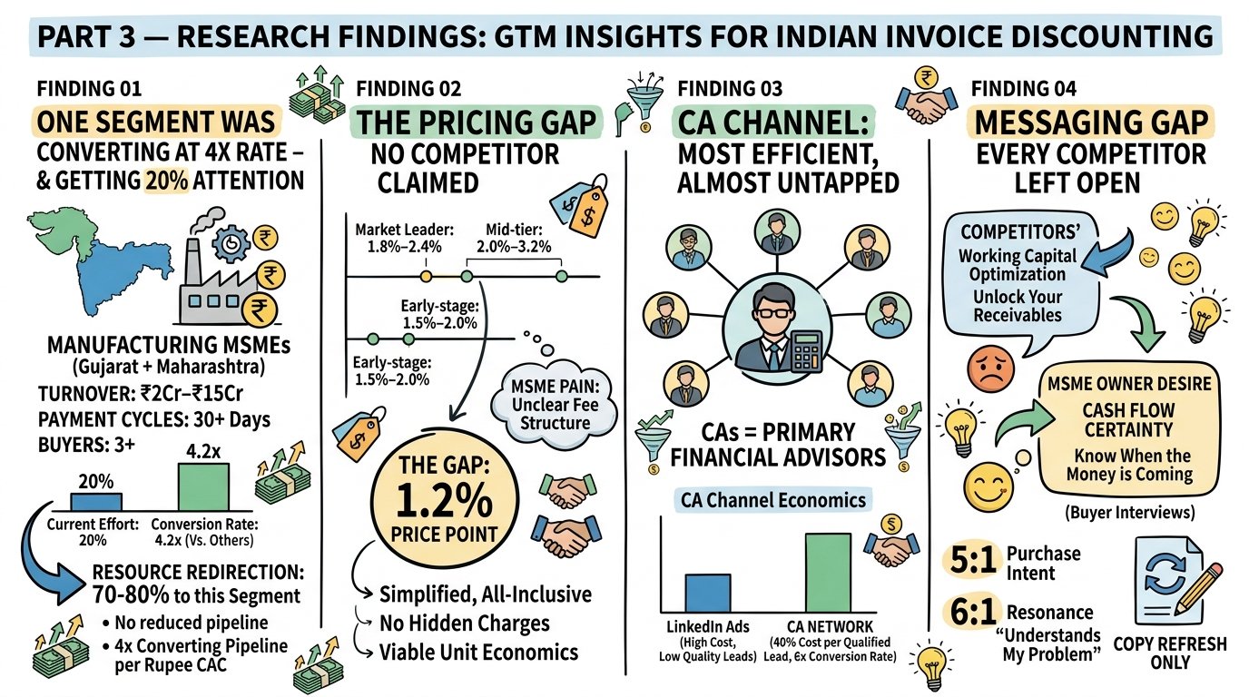 The buyer interview research — specifically the 4 structured conversations with Chartered Accountants who advise MSME clients — revealed a channel dynamic that the founders had not considered in their marketing strategy: Chartered Accountants are the primary financial decision advisor for Indian MSMEs, and they actively recommend working capital solutions to clients.