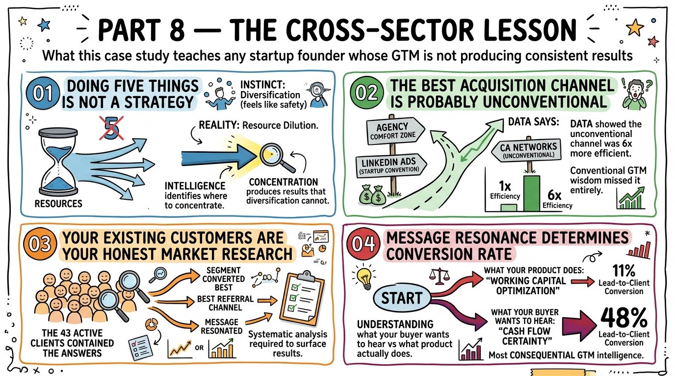 Lesson 03: Your existing customers are your most honest market research. The 43 active clients in this case study contained the answer to every significant GTM question — which segment converted best, which channel produced the best referrals, which message resonated. The answers were available. They required a systematic analysis to surface.