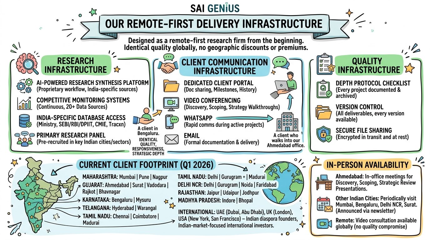 SAI GENiUS was designed from the beginning as a remote-first research firm. Every aspect of our research system, client communication process, and delivery infrastructure was built to deliver identical quality — regardless of whether the client is in our home city or in a different country entirely.