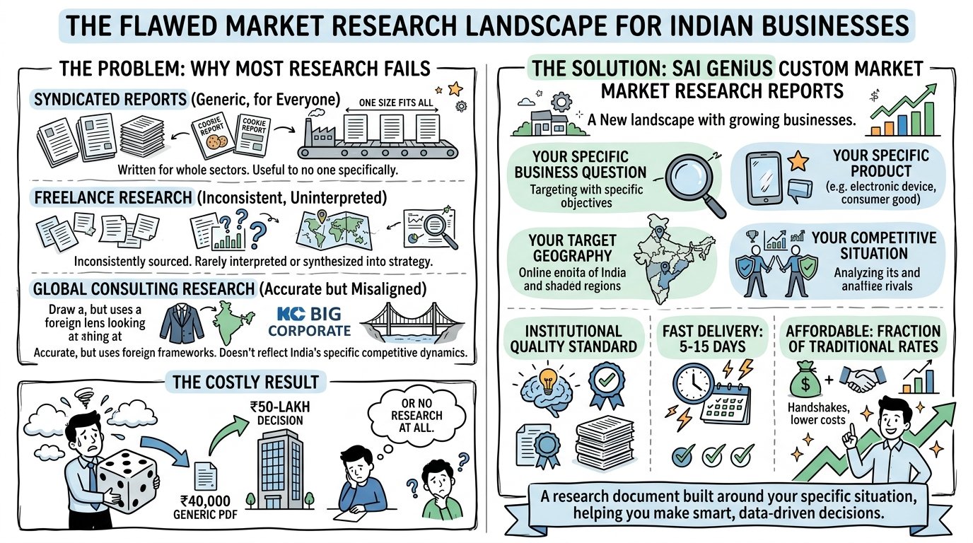 The result is a market in which Indian founders and business owners routinely make ₹50-lakh decisions based on ₹40,000 generic PDFs — or, more commonly, based on no research at all.